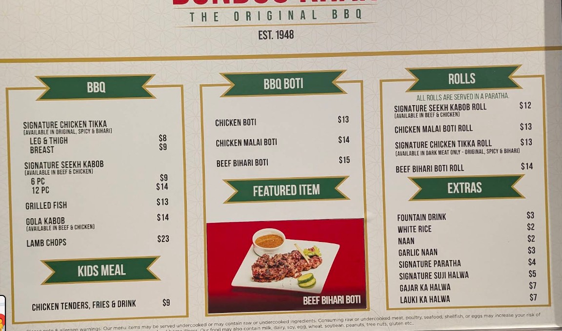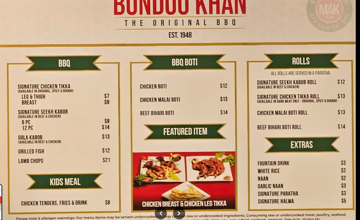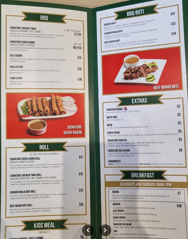 Authentic Pakistani bbq flavor, delicious kababs and on point parathas. We tried rolls, chicken tikka, gola and bihari kabab, and falooda, all were tasty. This restaurant is self serving kind, you place order on kiosk and pick yourself. Can be crowded with no seating available inside. Parking and restroom available.