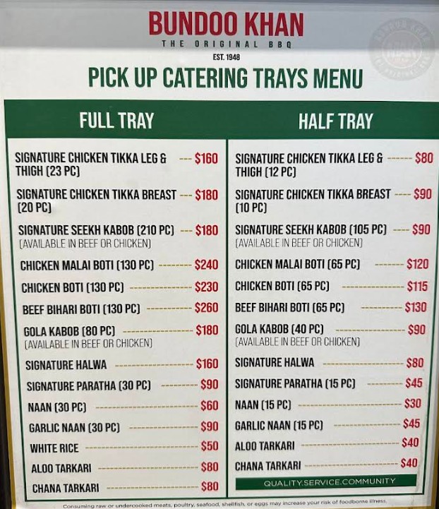 Bundoo Khan is open on Monday, Tuesday, Wednesday and Thursday from 11:00 AM - 12:00 AM; Friday from 11:00 AM - 1:00 AM; Saturday from 10:00 AM - 1:00 AM; Sunday from 10:00 AM - 12:00 AM.